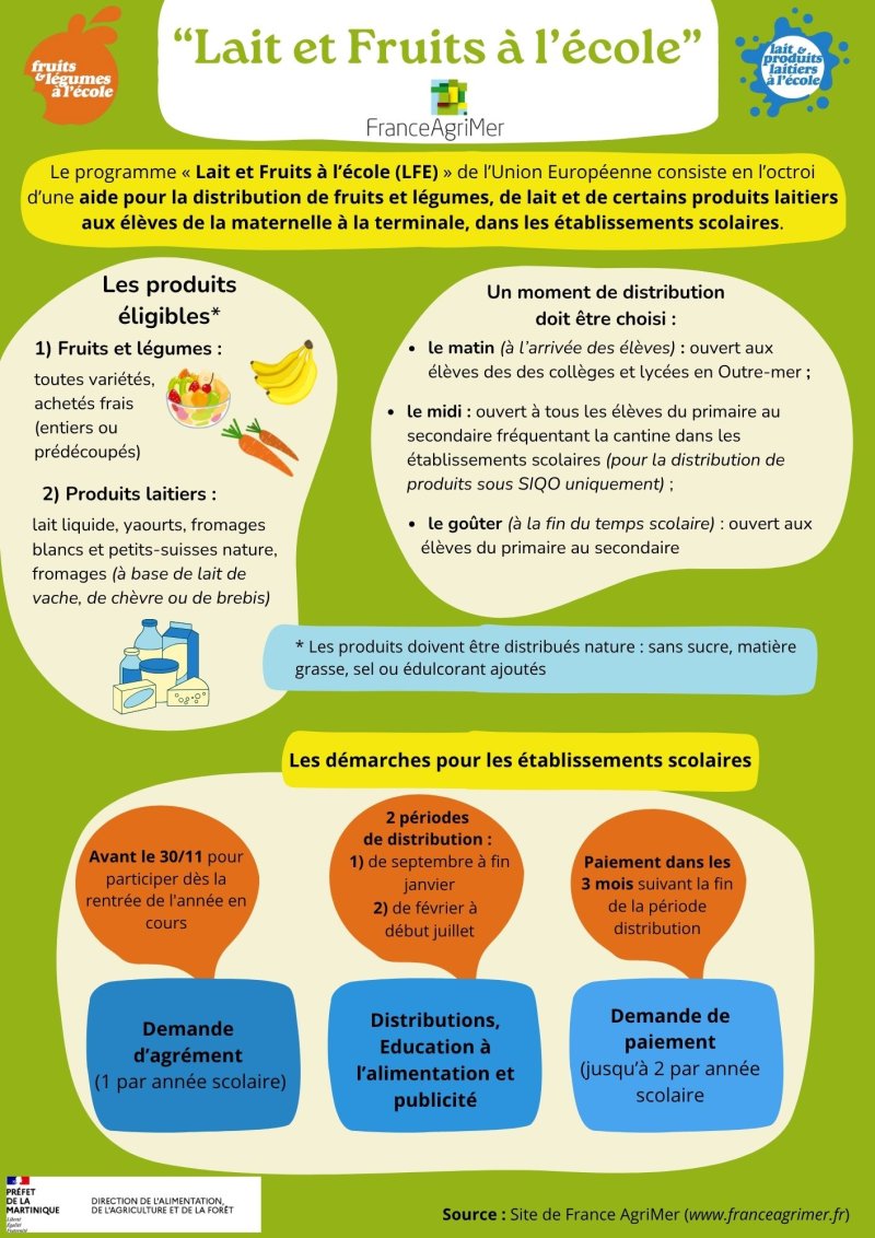 Le programme « Lait et Fruits à l’école » de l’Union Européenne consiste en l’octroi d’une aide pour la distribution de fruits et légumes, de lait et de certains produits laitiers aux élèves de la maternelle à la terminale, dans les établissements scolaires.