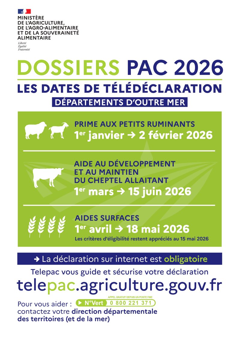 Cette affiche rappelle les dates clés pour la campagne 2026 de télédéclaration des aides de la PAC.